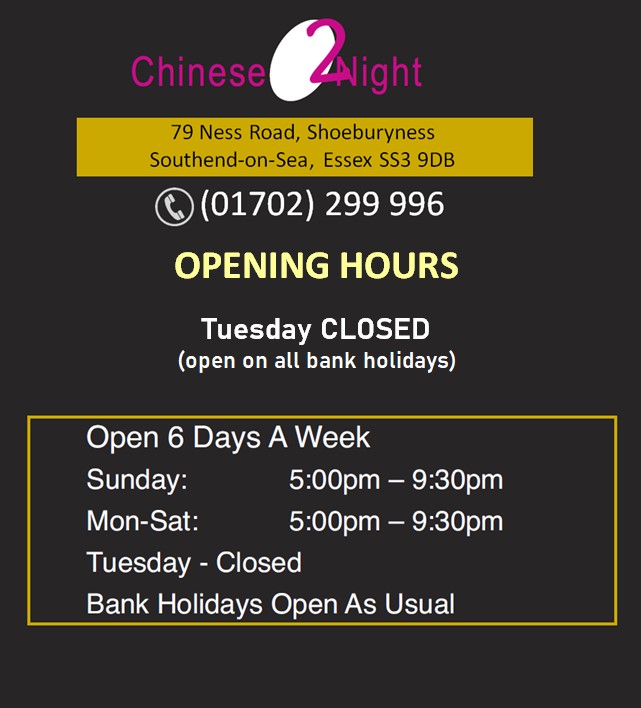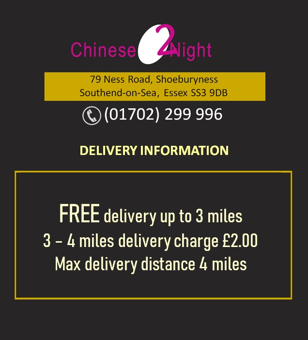 Chinese 2 Night @Southend-on-Sea Chinese Takeaway serves variety of delicious Chinese dishes. We’re passionate about delivering hot, great tasting, freshly prepared Chinese food to our customers